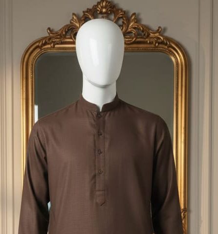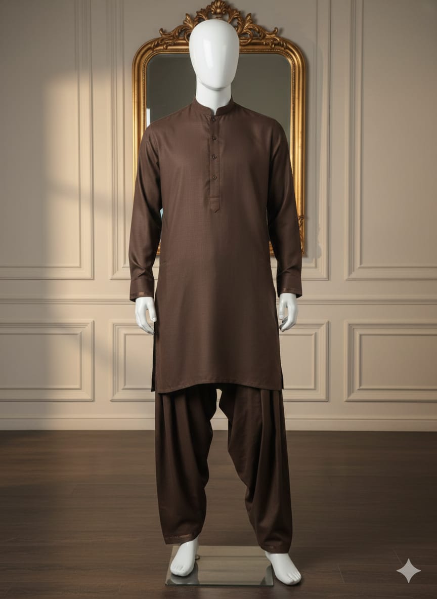 This men’s unstitched shalwar qameez is made from high-quality Paris wool, specially designed for the winter season. The rich chocolate brown color gives a classy and sophisticated look, suitable for both daily wear and formal occasions.