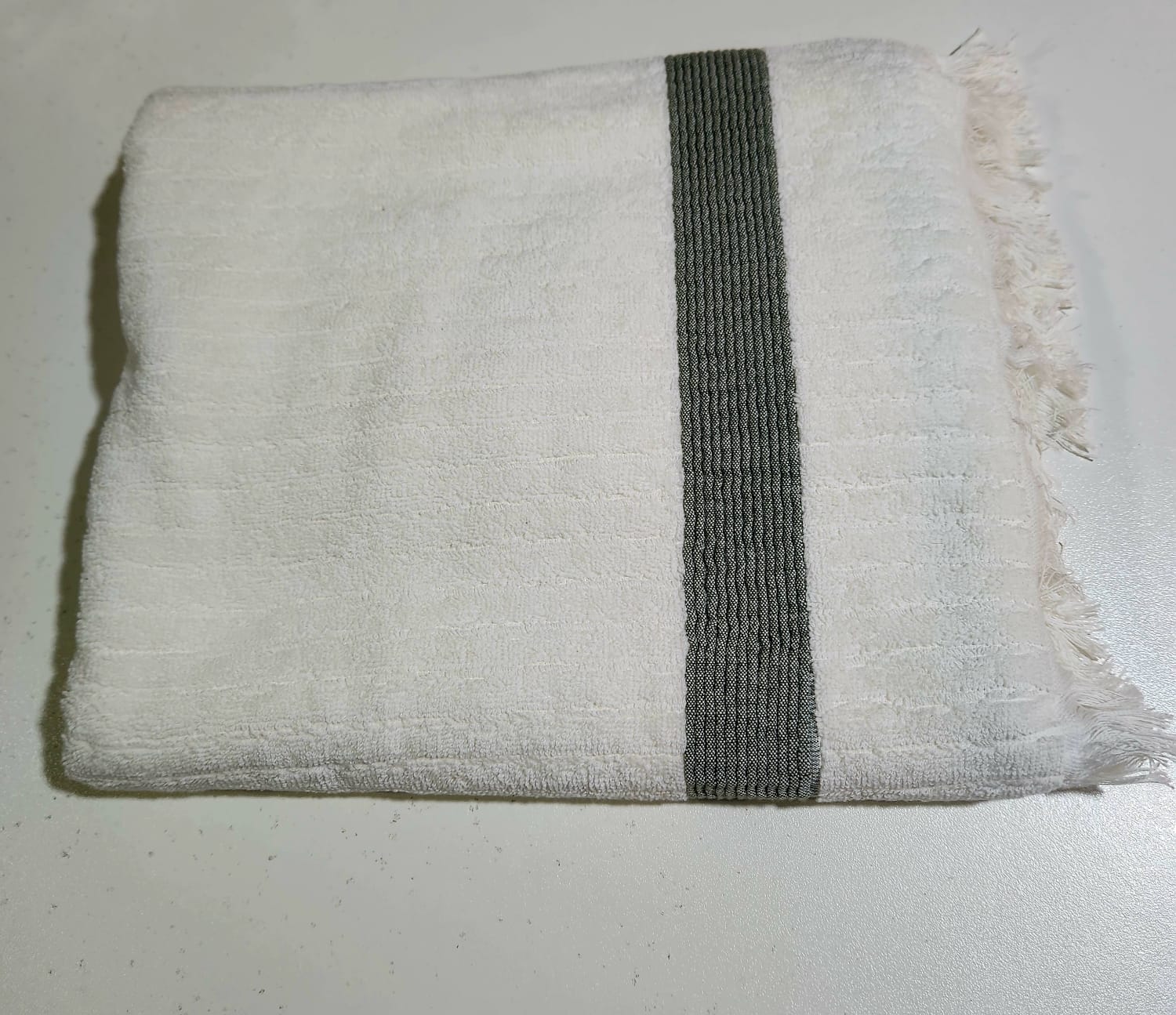 This bath towel is crafted from export quality pure cotton, ensuring superior softness, high absorbency, and long-lasting durability. The subtle off-white color is beautifully complemented by olive green border, adding a fresh and elegant touch.