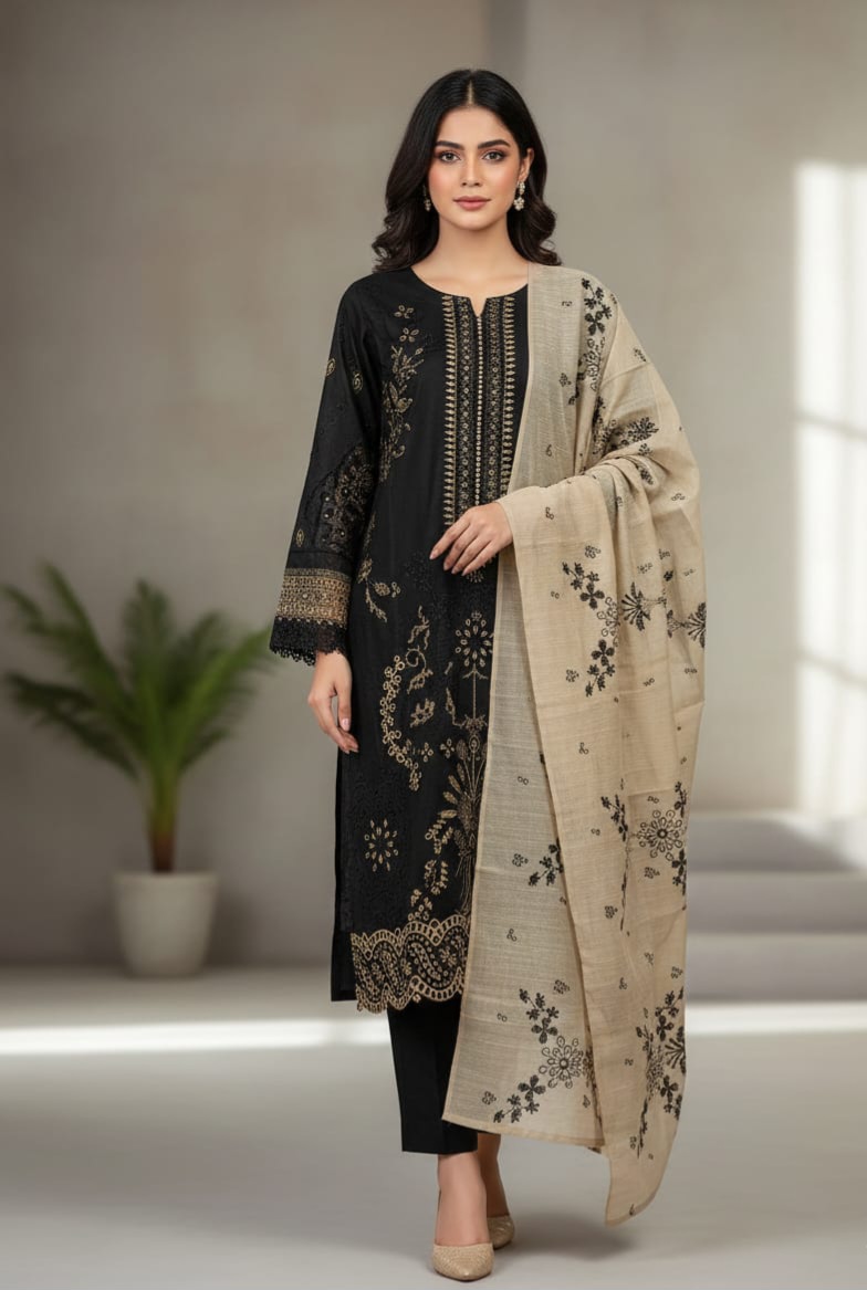 Stitched embroided 3 piece. Thread embroided lawn shirt. Masoori lawn embroided dupatta. Plain dyed trouser. Size : Small